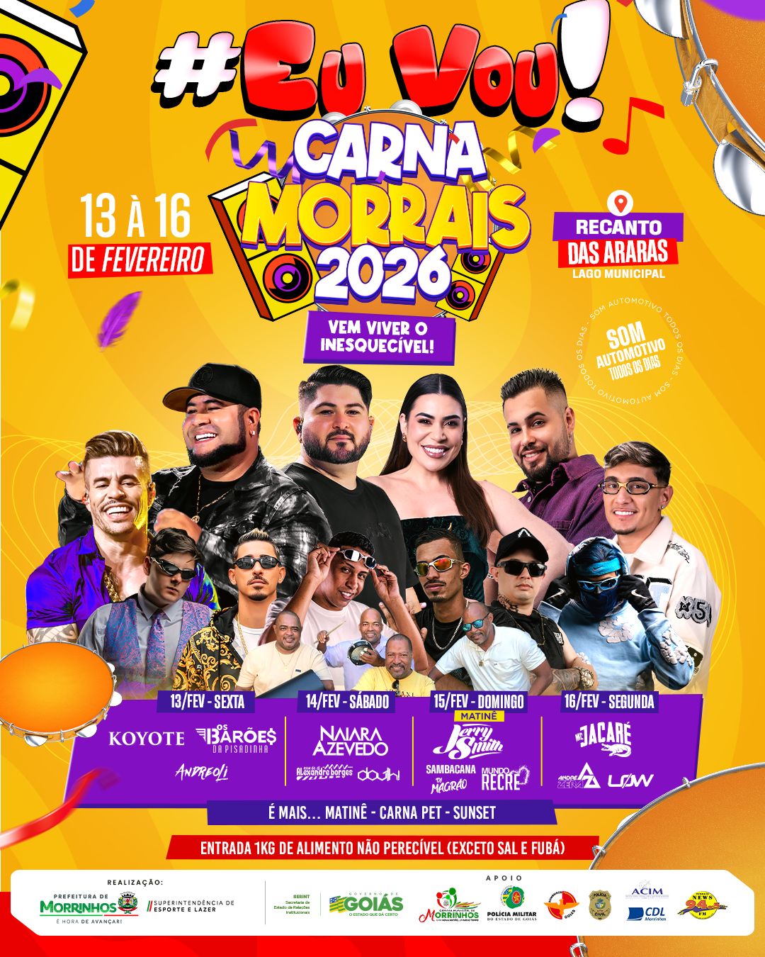 A Prefeitura de Morrinhos promove, entre os dias 13 e 16 de fevereiro, a edição 2026 do Carna Morrais, evento que integra o calendário oficial do município e deve receber público estimado em mais de 30 mil pessoas ao longo de quatro dias no Lago Recanto das Araras. Com início das atrações noturnas a partir das 20 horas, a programação reúne artistas de projeção nacional, ações de segurança pública, atividades para famílias e arrecadação de alimentos para a rede de assistência social.